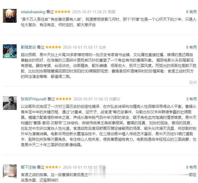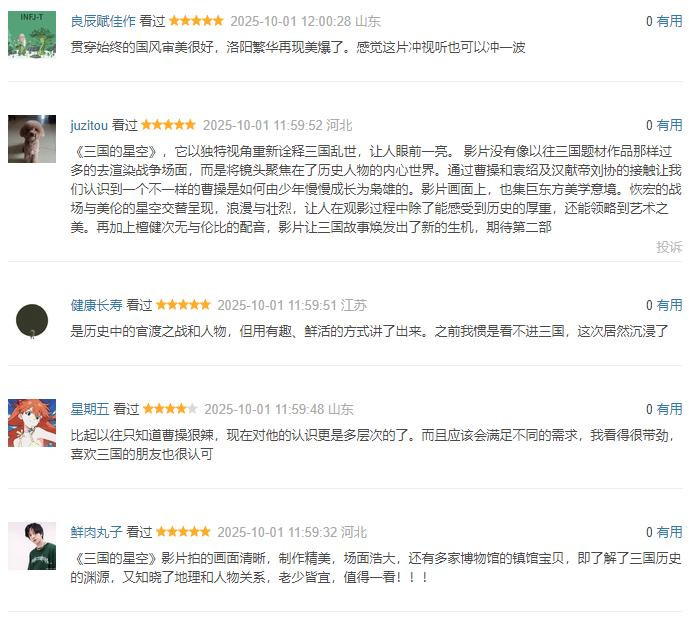 很多观众在看过《三国的星空第一部》后,为这部电影打出了满屏五星好评,大家都惊讶易中天竟然将“三国”做出了“新”内容,曾经对历史好不感兴趣的女生们,这次也居然可以沉浸进入剧情。